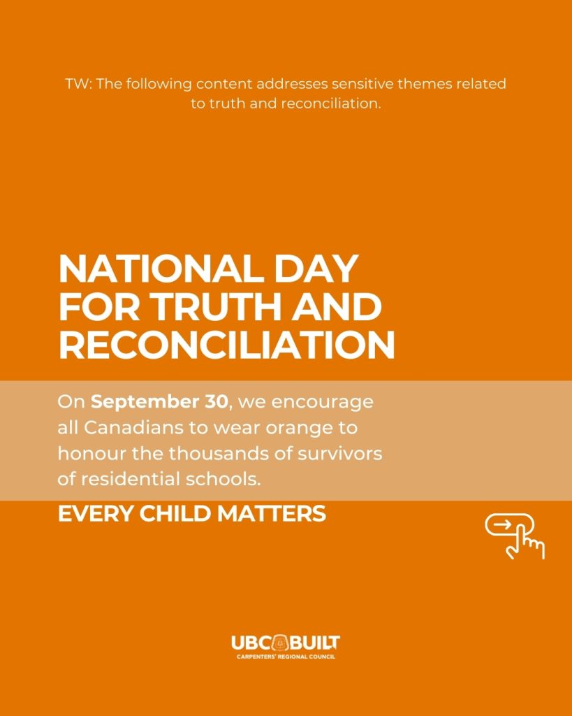 In recognition of the National Truth and Reconciliation Day on Tuesday, September 30, 2025, all Carpenters’ Regional Council halls and offices in Alberta will be closed to the public. This includes Alberta Carpenters Training Centre (ACTC) locations.